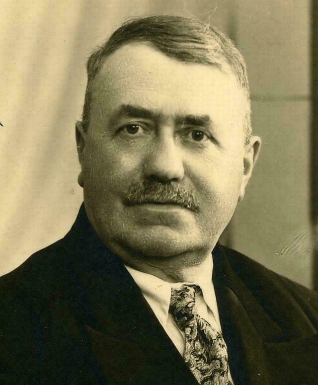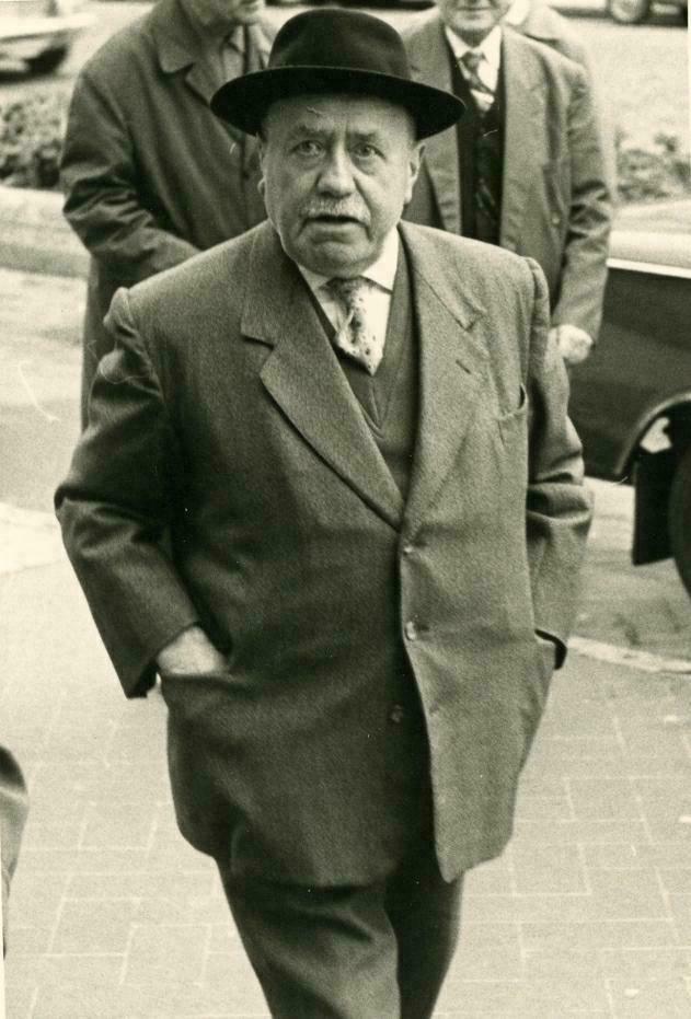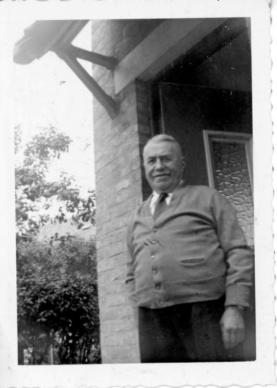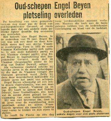 Engel Beyen, links achter de schouder van pastoor Deridder en zijn vader, Hippoliet Beyen aan de andere zijde, rechts van de pastoor. Foto genomen in 1933 bij de installatie van de tweede burgemeester van De Panne, Abel De Wulf.