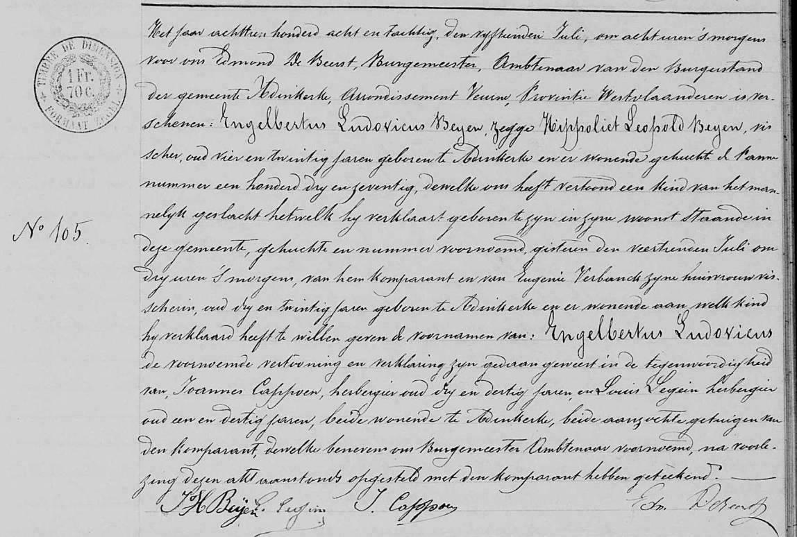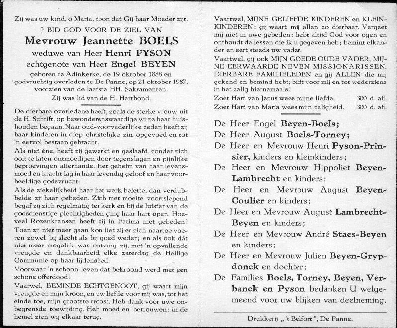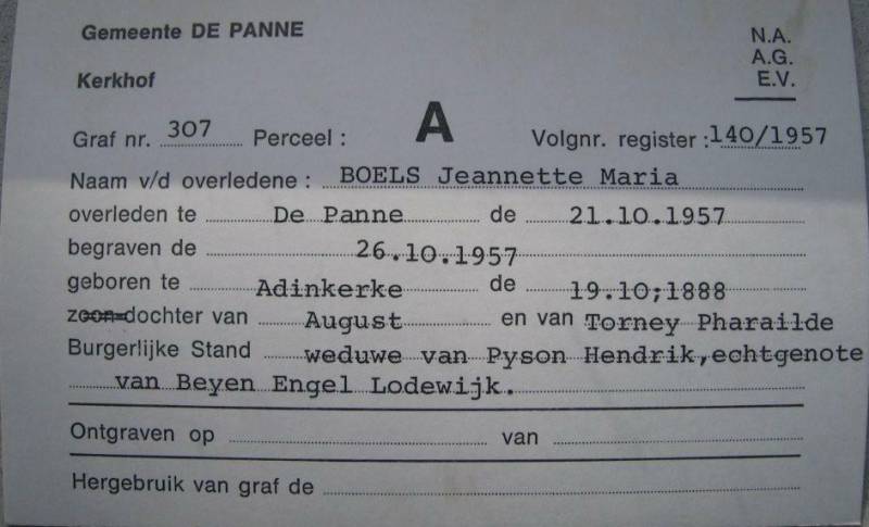 Aangifte van overlijden: Le quatre mai mil neuf cent dix huit, huit heures du soir, Anna Maria Boels, ménagère, de nationalité belge, née à Adinkerke, Belgique, le vingt cinq août mil huit cent quatre vingt douze, de Auguste Boels, marin, et de Pharailde Torney, sans profession, épouse de Engelbert Ludovic Beyen, domiciliée à La Panne, Belgique, est décédée, rue de l'Anguainerie, 19. Délivré le cinq mai mil neuf cent dix huit, neuf heures et demie du matin sur la déclaration de Amelie Madou femme [de] Charles Maes, vingt six ans, ménagère, et de Joseph Boels, vingt quatre ans, p��cheur, fr��re de la défunte, tous deux domiciliés �� La Panne, Belgique, qui lecture faite ont signés avec nous, Alexandre Laurent, second adjoint au Maire du Tréport, officier d'état civil par dél����gation.