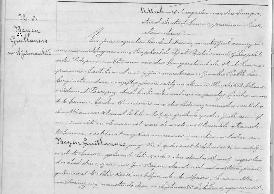 Guilliaume werd geboren op 3 maart 1903 in Adinkerke.1 Zijn peters waren Jan Cappoen, oud 49, herbergier, Adinkerke en zijn meters waren Seraffijn Thieren, oud 40, bakker, Adinkerke.