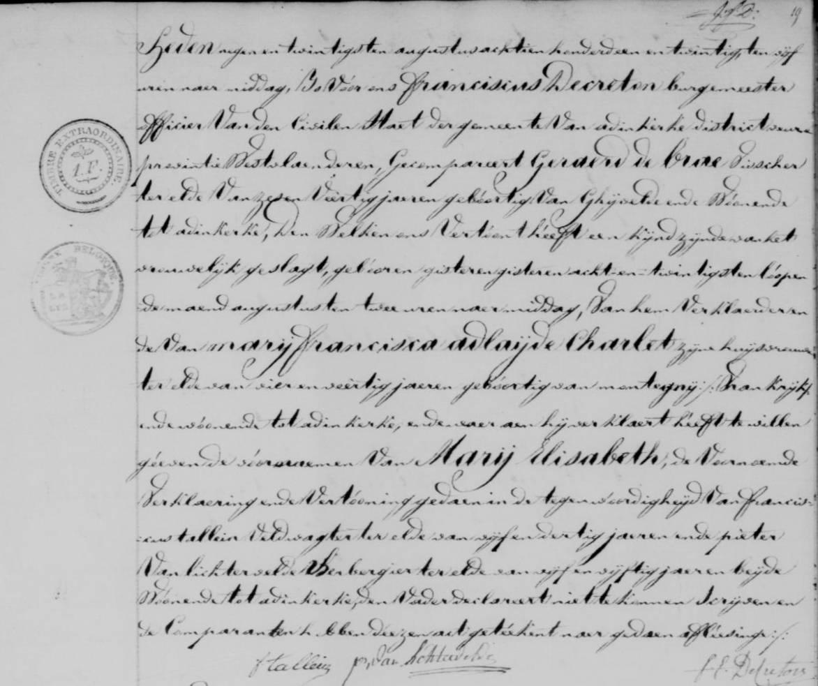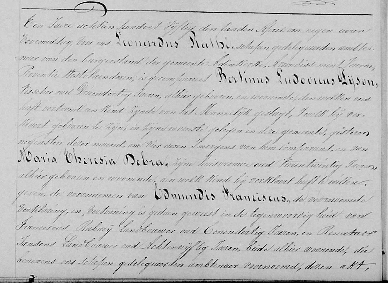 De geboorte werd aangegeven door Anna Maria Goubert, 71 jaar oud, die geholpen heeft bij de bevalling in de woonst van de moeder, gelegen Panne #287. Bertinus was toen reeds overleden (3 januari 1859).