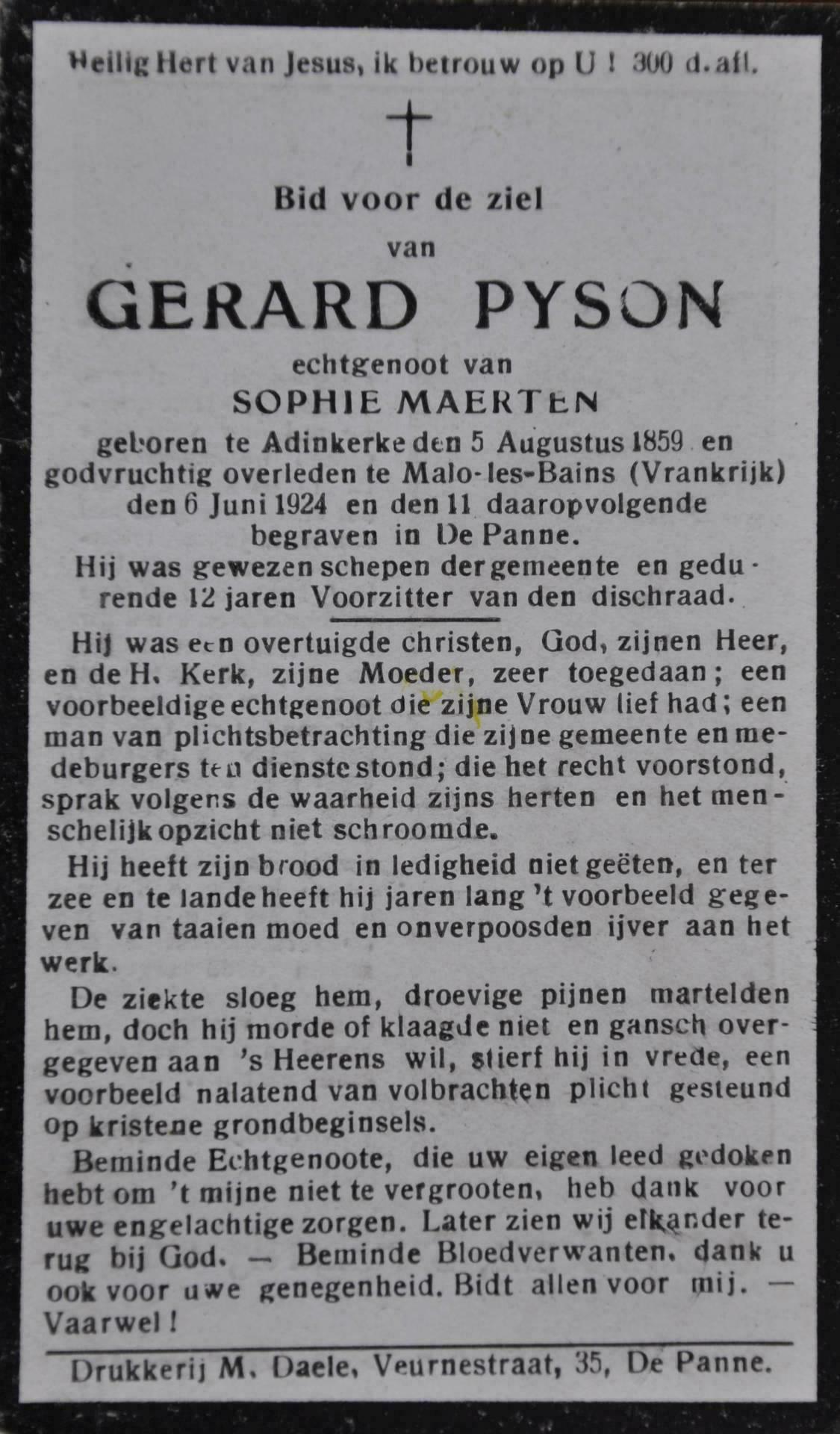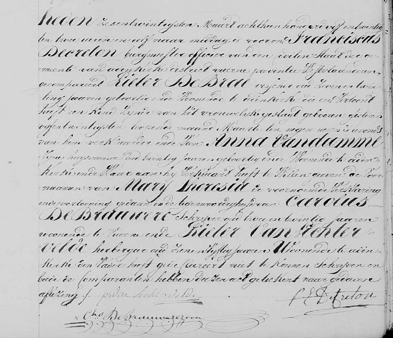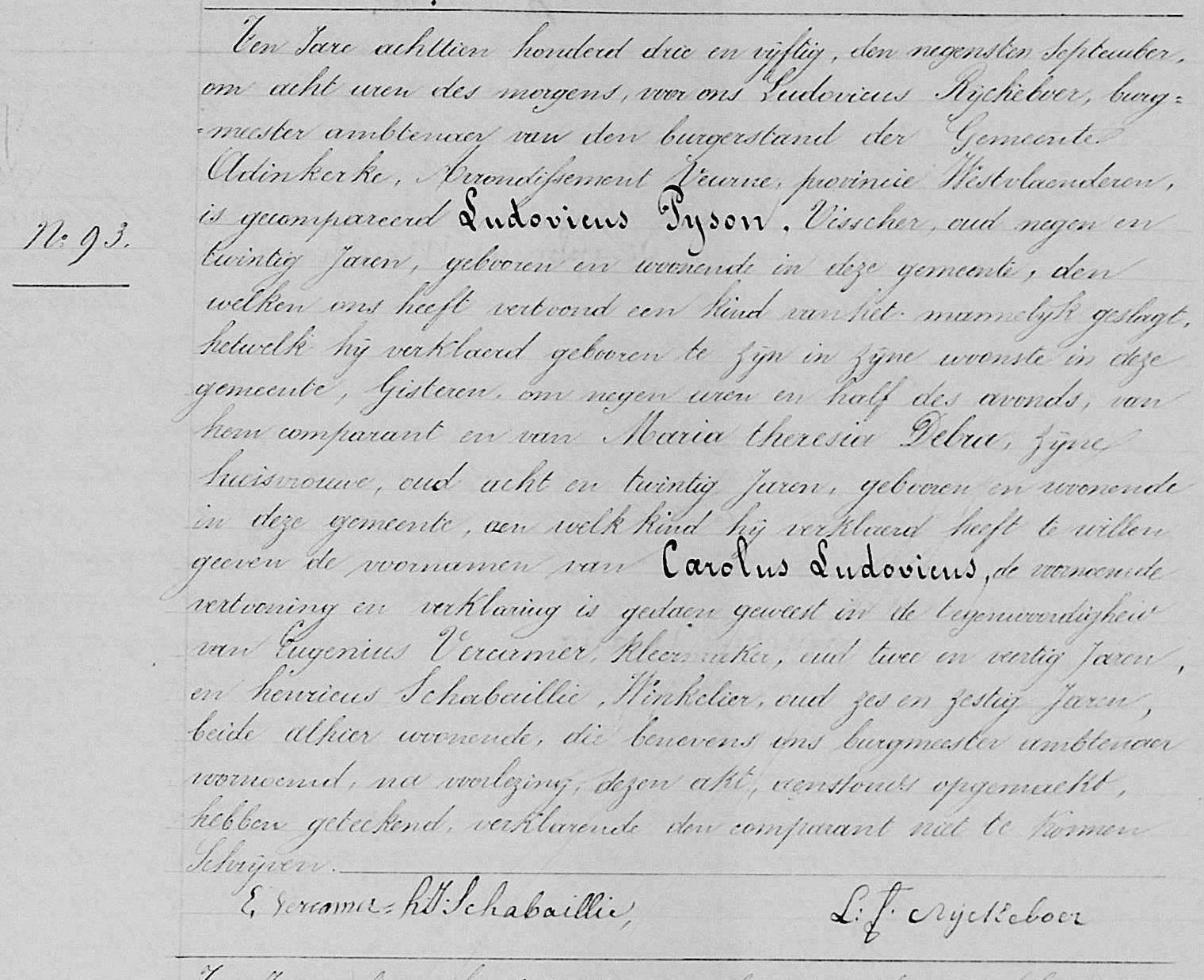 Uit de huwelijksakte: ... de comparanten verklaeren en bevestigen onder eed, dat de persoon bekend in zijn overlijdens akt onder de naem en voornaem van Ludovicus Pyson [de vader van de bruidegom] den zelven is die in het geboorte extrakt van den bruidegom, en in den tegenwoordigen akt gekend zijn onder de naem en voornaemen Van Ludovicus Franciscus Pynson ...