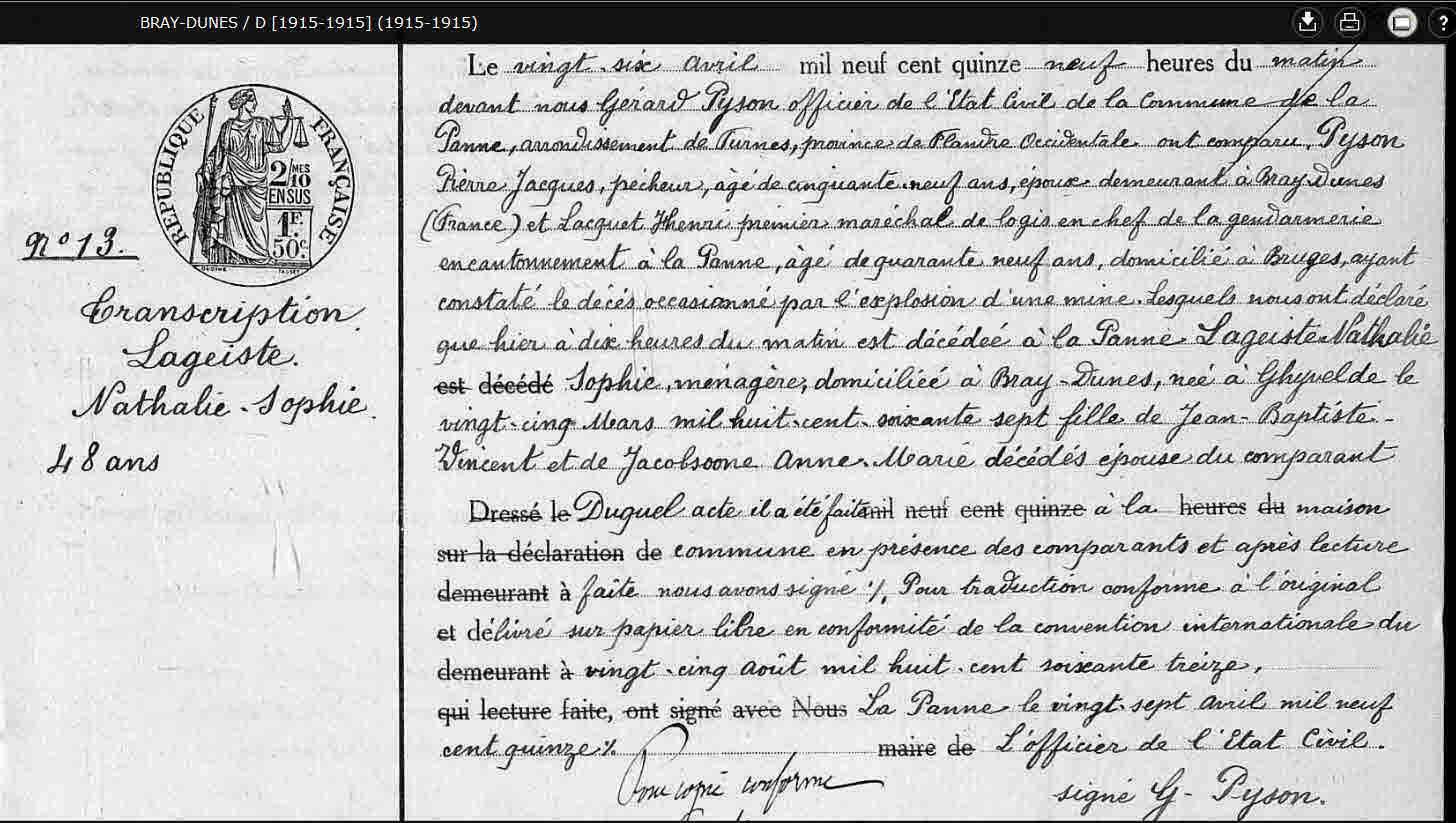 Bij de census van 1906 woonden Pierre Pyson en Natalie Lageiste in Bray-Dunes.