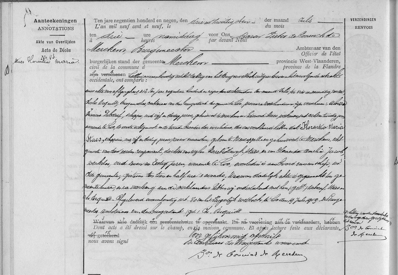 Overlijdensakte uit 1909, register gemeente Merkem.