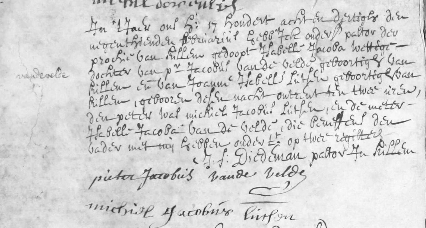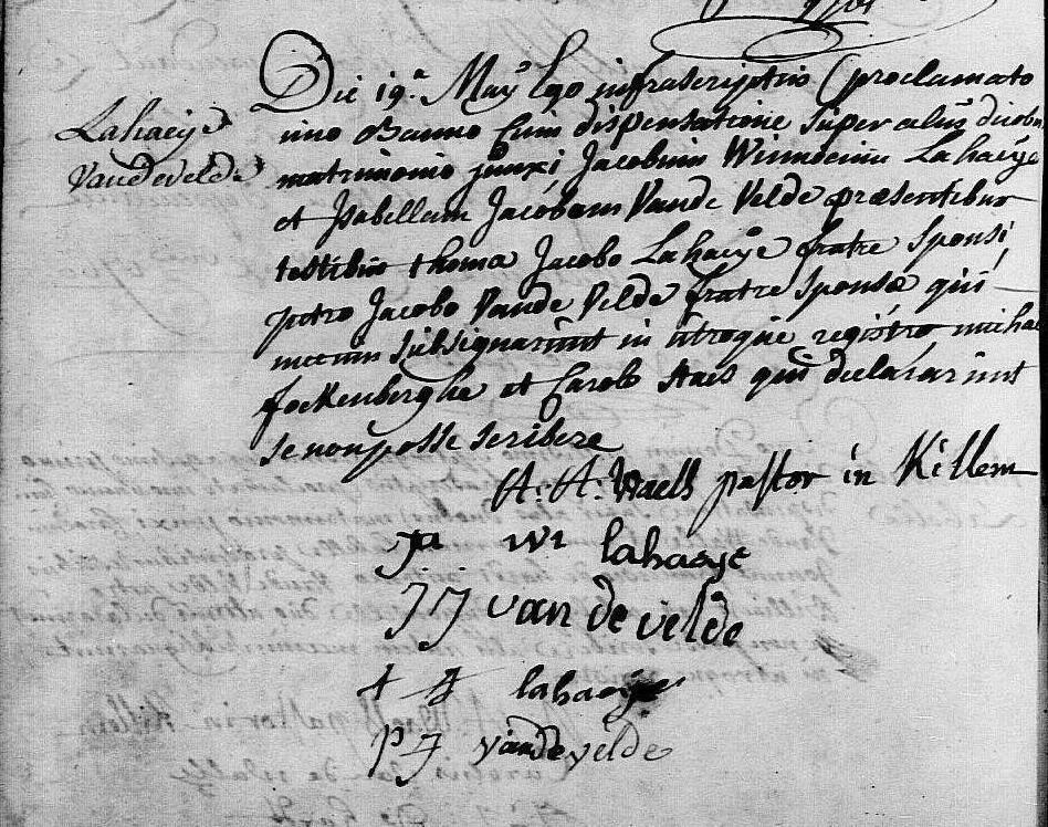 Getuigen waren Thomas LAHAEYE (broer van Jacobus), Petrus Jacobus VANDEVELDE (broer van Isabella), Michael FOCKENBERGHE en Carolus STAES.