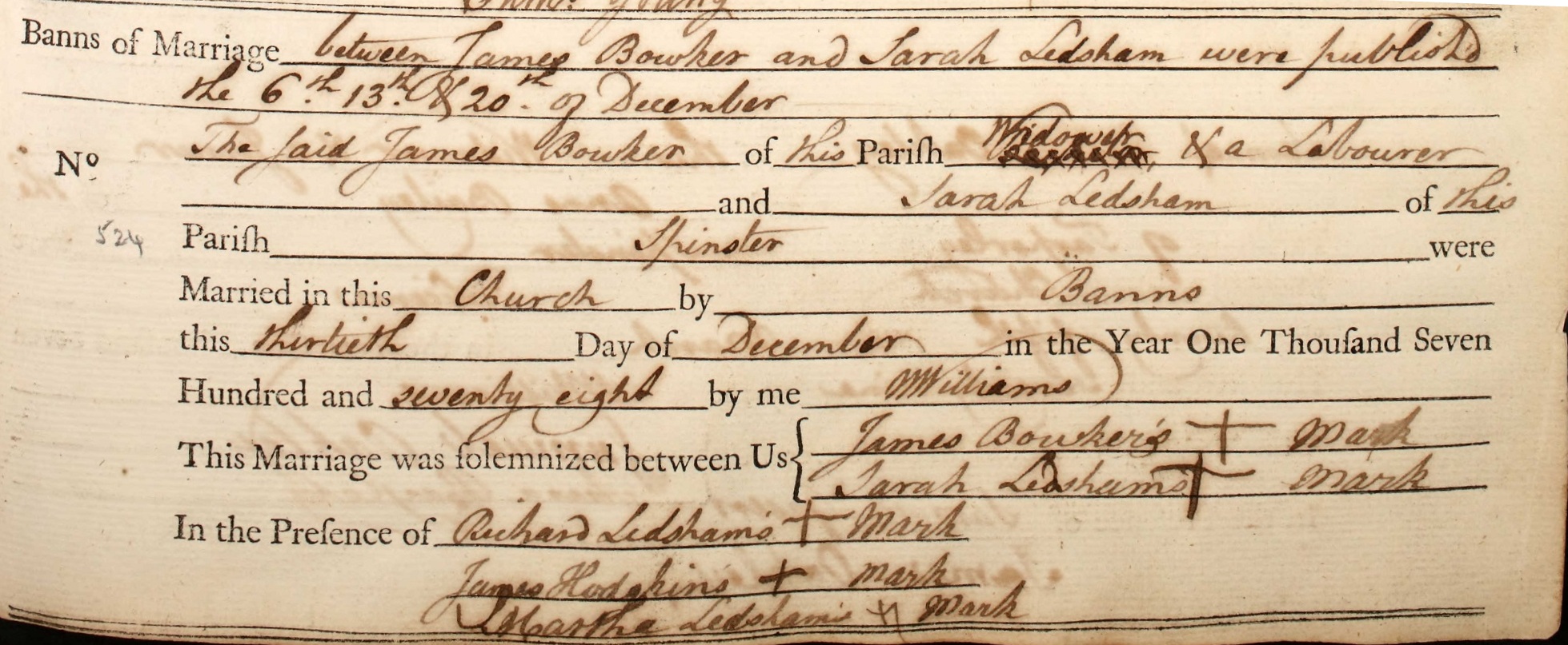 This picture, '1778 Sarah Ledsham & James Bowker', was taken on December 30th, 1778 and sourced from Certificate - Marriage.