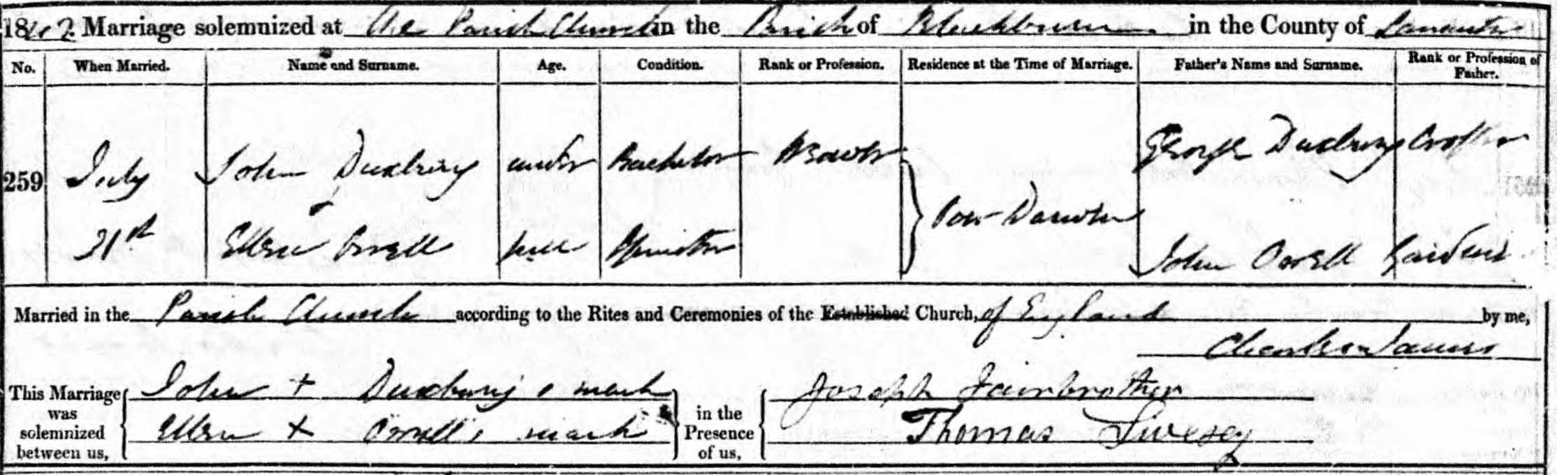 ‌John and Ellen were married in a religious ceremony on July 31st, 1842 at St. Paul (Blackburn).1