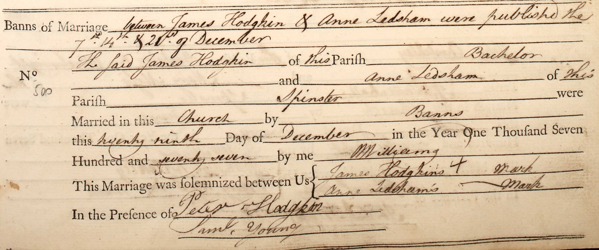 This picture, '1777 Ann Ledsham & James Hodgkin', was taken on December 29th, 1777 and sourced from Certificate - Marriage.