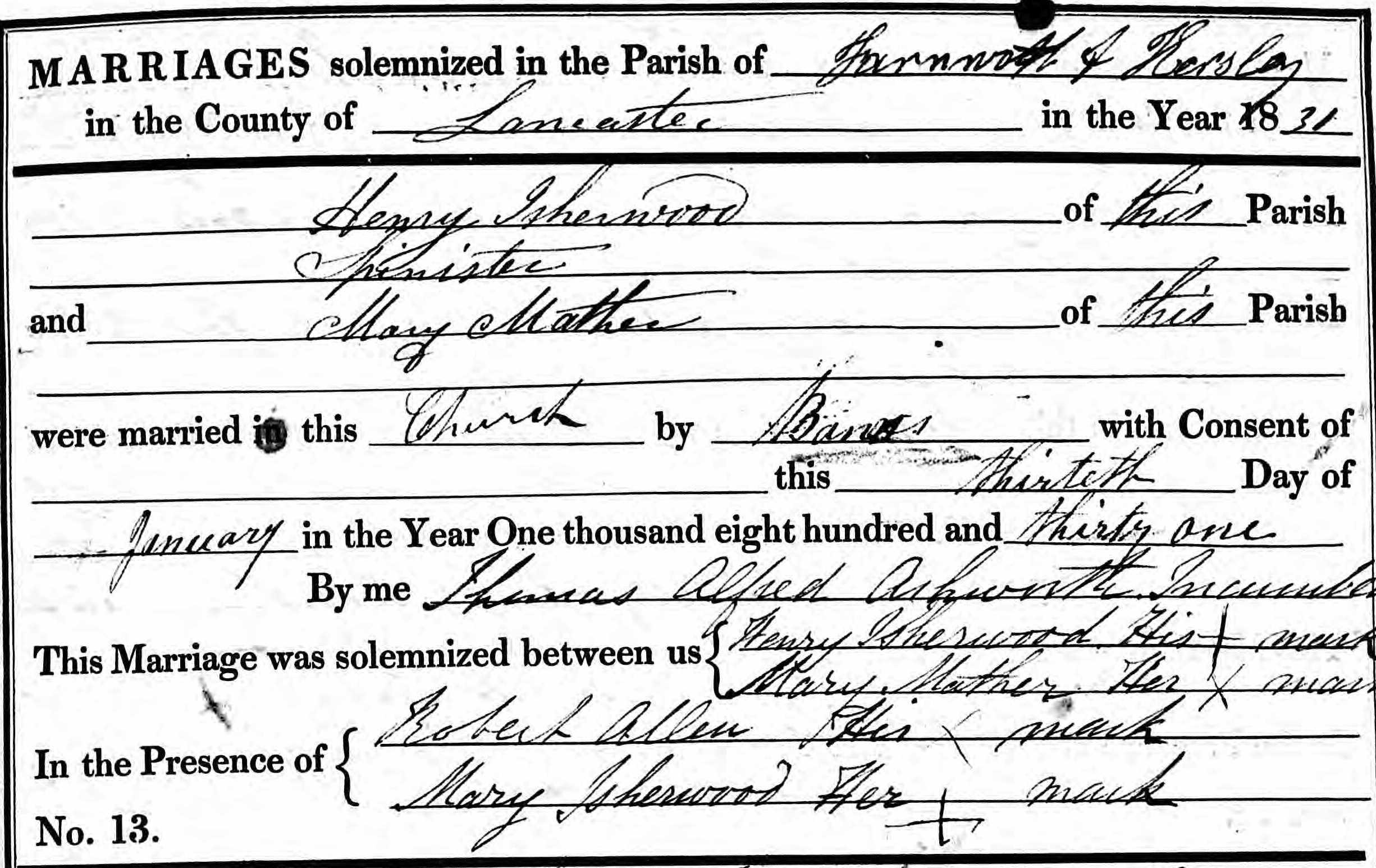 ‌Mary and Henry were married in a religious ceremony on January 30th, 1831 in Farnworth witnessed by Robert Allen & Mary Isherwood.1  They had a son and a daughter, named Richard and Mary.