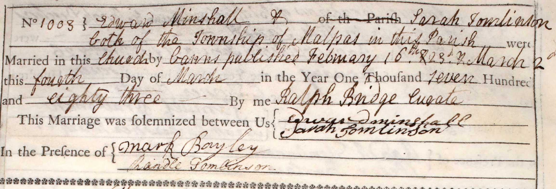 This picture, '1783 Edward Minshall & Sarah Tomlinson', was taken on March 4th, 1783 and sourced from Certificate - Marriage.