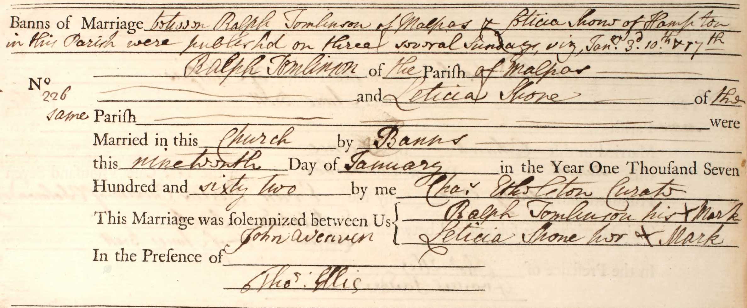 ‌Leticia and Ralph were married in a religious ceremony on January 19th, 1762 at St. Oswalds (Malpas).1   They had two sons and four daughters, named Samuel, Ralph, Eliza, Martha, Mary and Sarah.