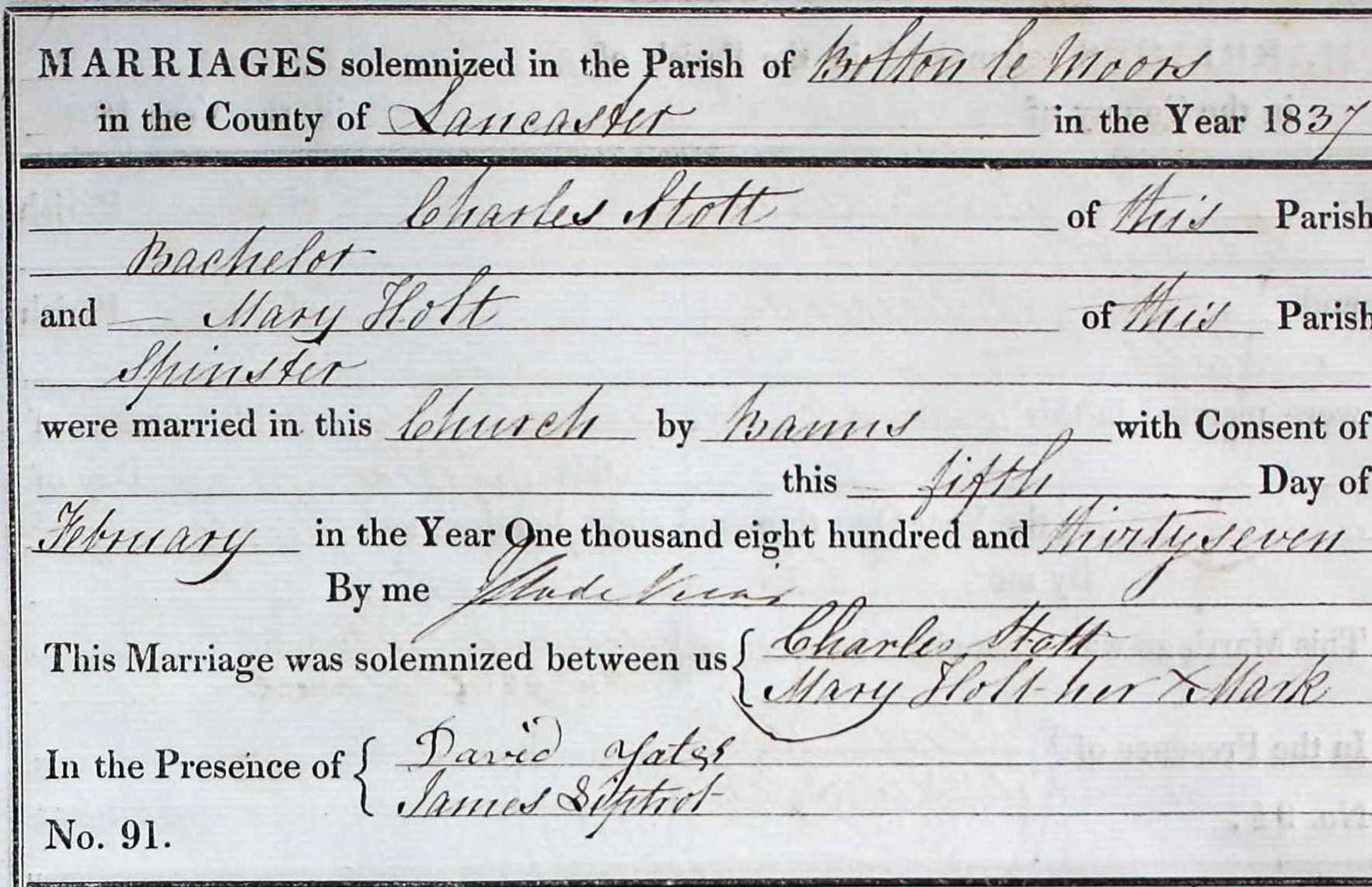 Charles and Mary were married in a religious ceremony on February 5th, 1837 at St. Peter's (Bolton) by Vicar J Slade and witnessed by David Yates & James Liptrot.3 They had a son named Robert. There are no more children.