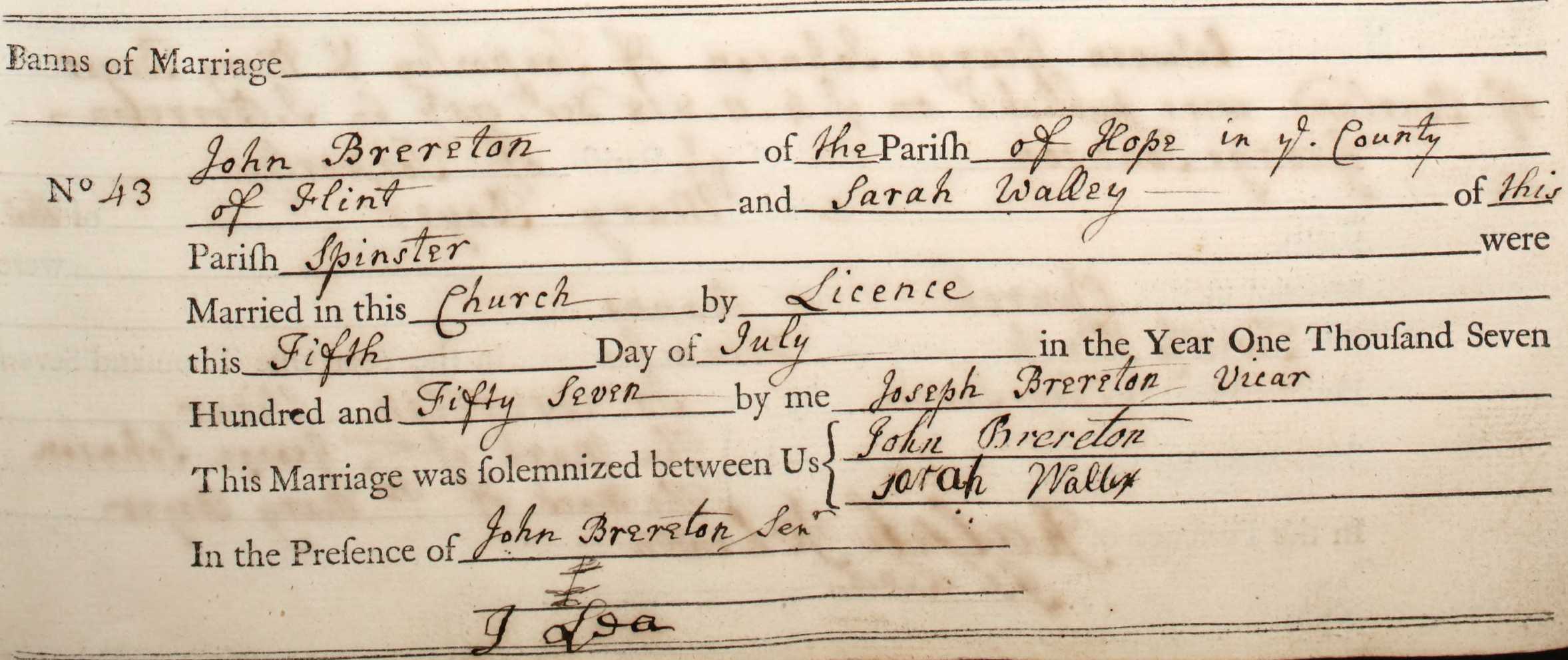This picture, '1757 John Brereton & Sarah Walley', was taken on July 5th, 1757 and sourced from Certificate - Marriage.