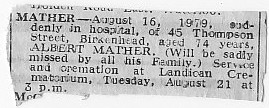 MATHER – August 16 1979, suddenly in hospital, of 45 Thompson Street, Birkenhead, aged 74 years. ALBERT MATHER. (Will be sadly missed by all his family.) Service and cremation at Landican Crematorium, Tuesday August 21 at 3pm.