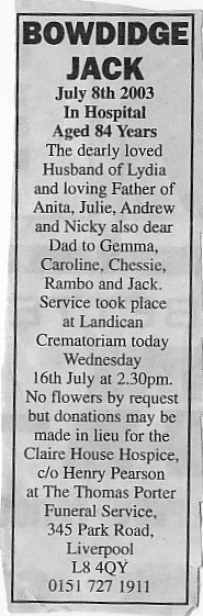July 8th 2003 In Hospital, aged 84 years. The dearly loved husband of Lydia and loving father of Anita, Julie, Andrew and Nicky. Also dear Dad (should read granddad) to Gemma, Caroline, Chessie, Rambo and Jack. Service took place at Landican Crematorium today Wednesday 16th July at 2:30pm. No flowers by request but donations may be made in lieu for the Claire House Hospice, c/o The Henry Pearson Funeral Service (Liverpool).