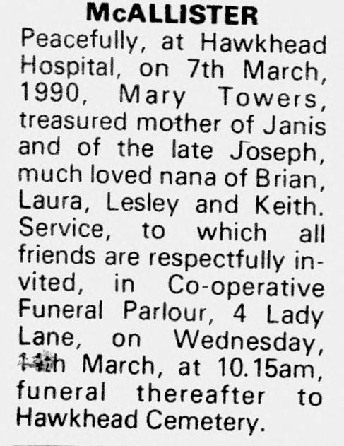 The cited information was sourced from Electronic Document (email, file) published by www.findmypast.co.uk on March 12th, 1990 (Ref: p. 7) The author/originator was Paisley Daily Express. This citation is considered to be direct and primary evidence used, or by dominance of the evidence.