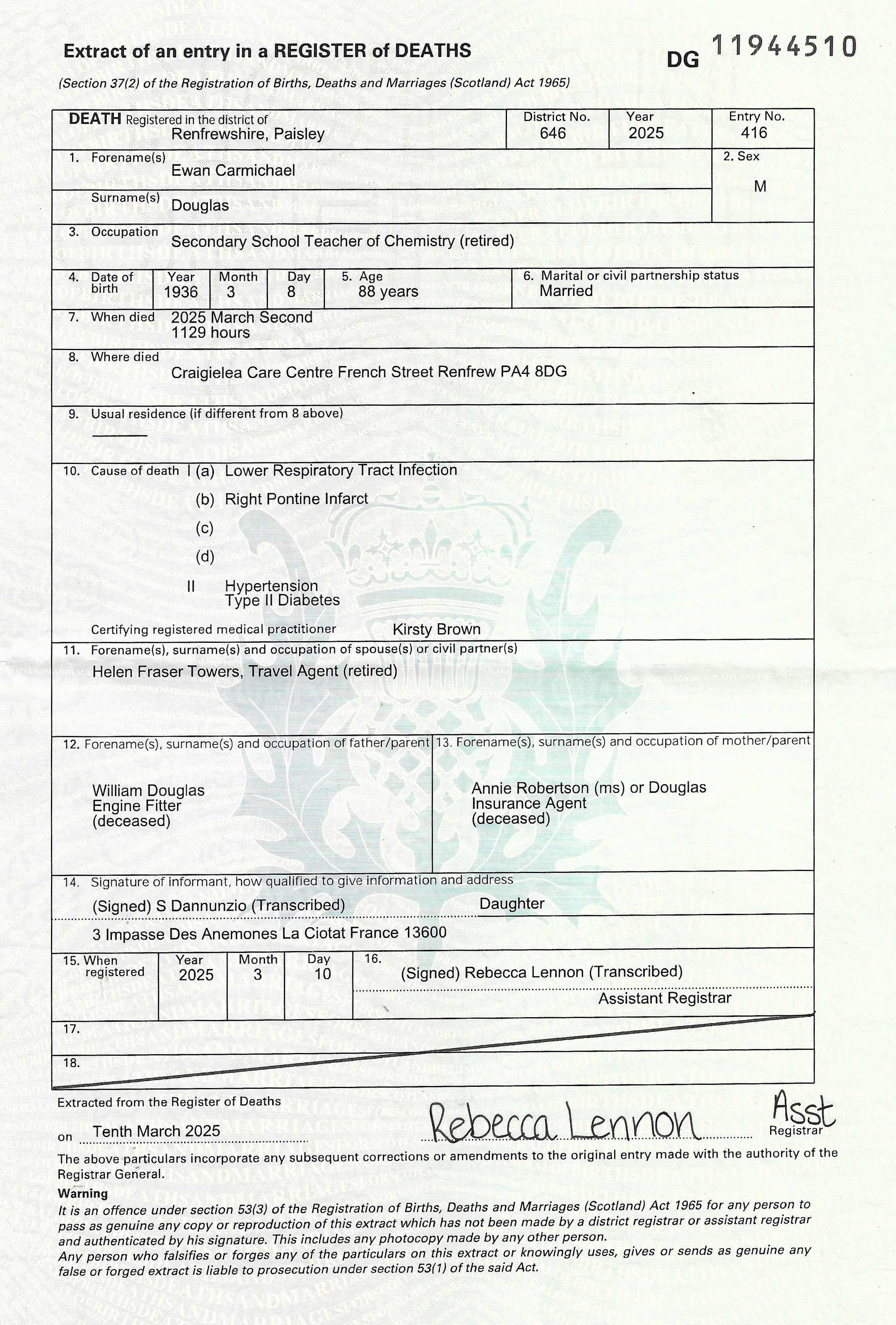 The cited information was sourced from Electronic Document (email, file) The author/originator was General Register Office, Scotland. This citation is considered to be direct and primary evidence used, or by dominance of the evidence.