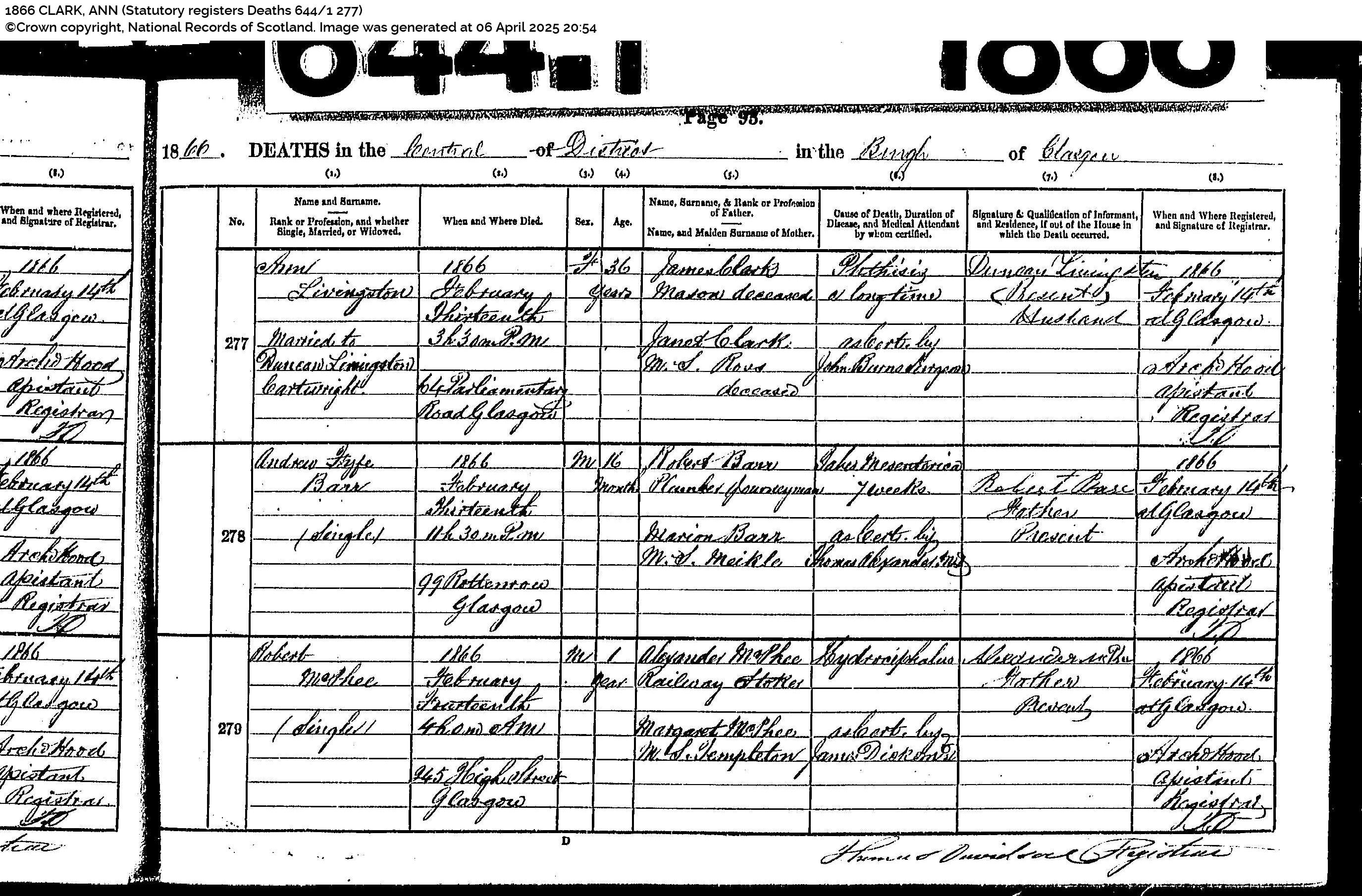The cited information was sourced from Electronic Document (email, file) published by www.scotlandspeople.gov.uk (Ref: CLARK ANN 36 ROSS F 1866 644 / 1 / 277 Glasgow Central District) The author/originator was General Register Office, Scotland. This citation is considered to be direct and primary evidence used, or by dominance of the evidence.
