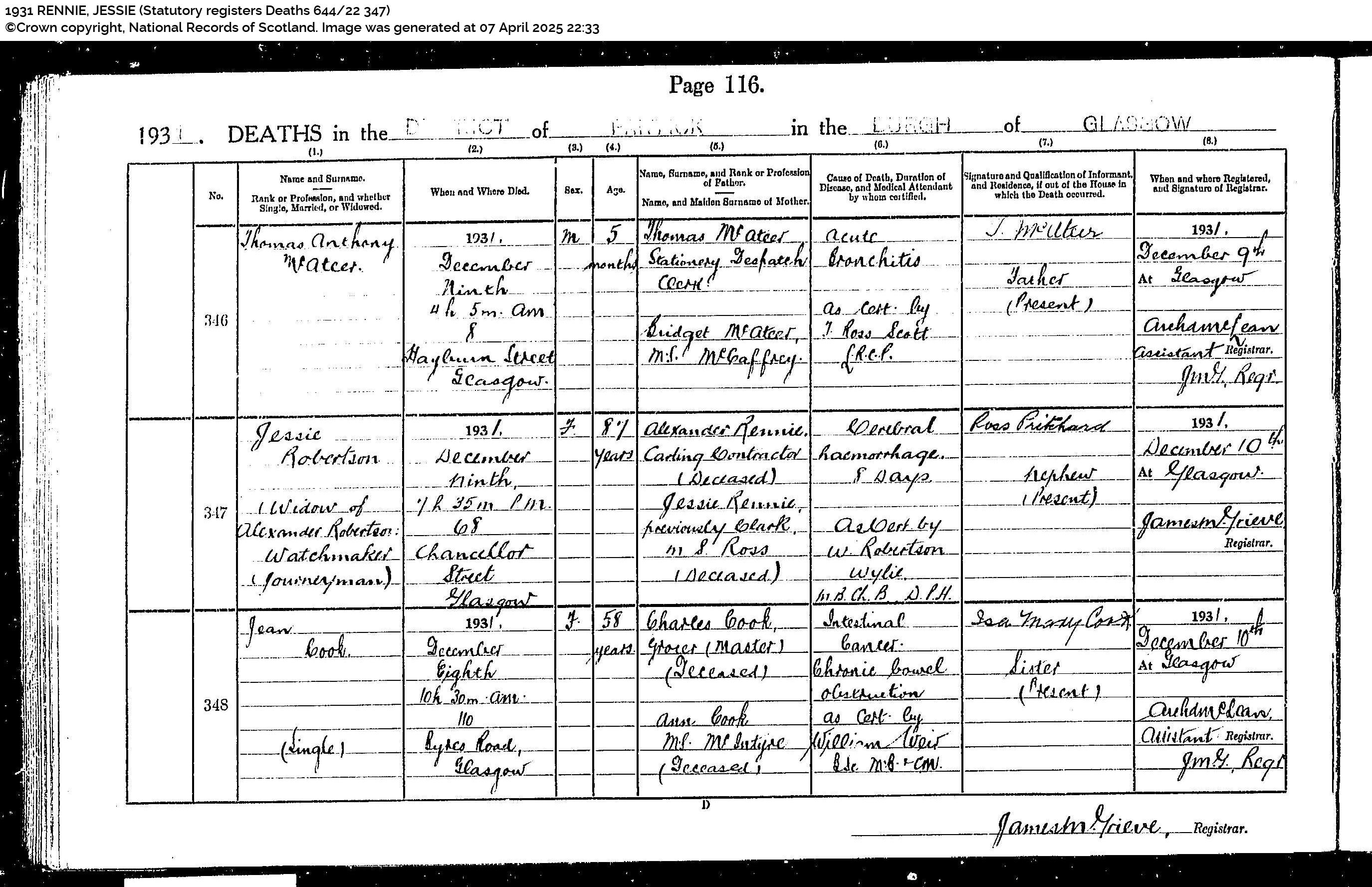 The cited information was sourced from Electronic Document (email, file) published by www.scotlandspeople.gov.uk (Ref: RENNIE other surname ROBERTSON JESSIE 87 ROSS 1931 644/22 347 Partick) The author/originator was General Register Office, Scotland. This citation is considered to be direct and primary evidence used, or by dominance of the evidence.