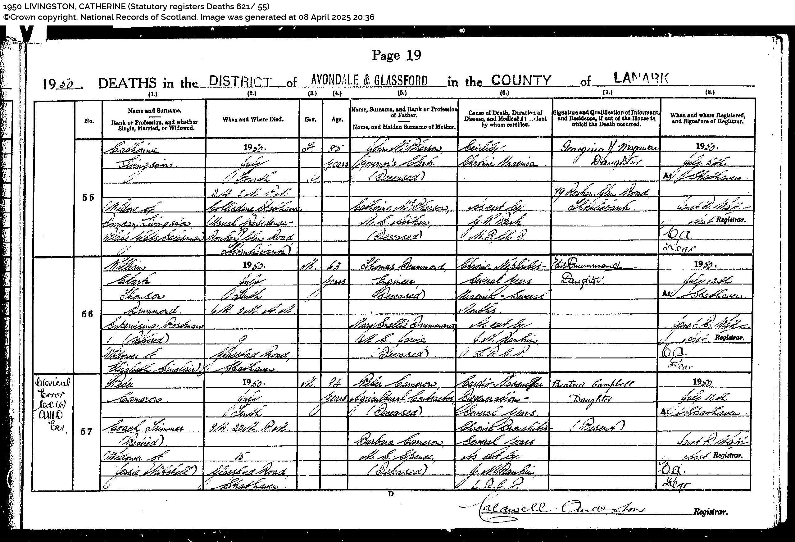 The cited information was sourced from Electronic Document (email, file) published by www.scotlandspeople.gov.uk (Ref: LIVINGSTON CATHERINE 85 F 1950 621 / 55 Avondale and Glassford) The author/originator was General Register Office, Scotland. This citation is considered to be direct and primary evidence used, or by dominance of the evidence.