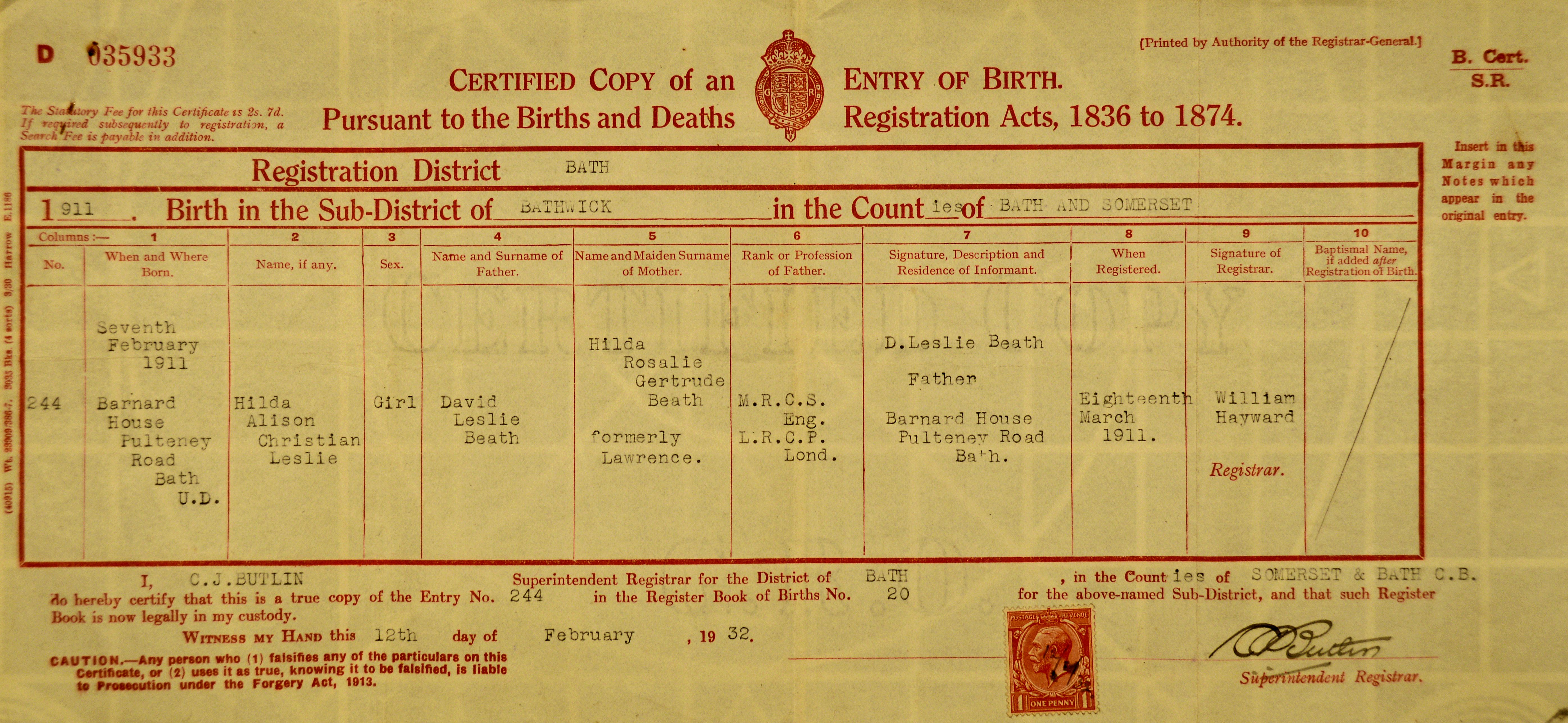 - b.07 Feb 1911 in Bath, Somerset, England d.12 Feb 1972 in Dartmouth, Devon, England