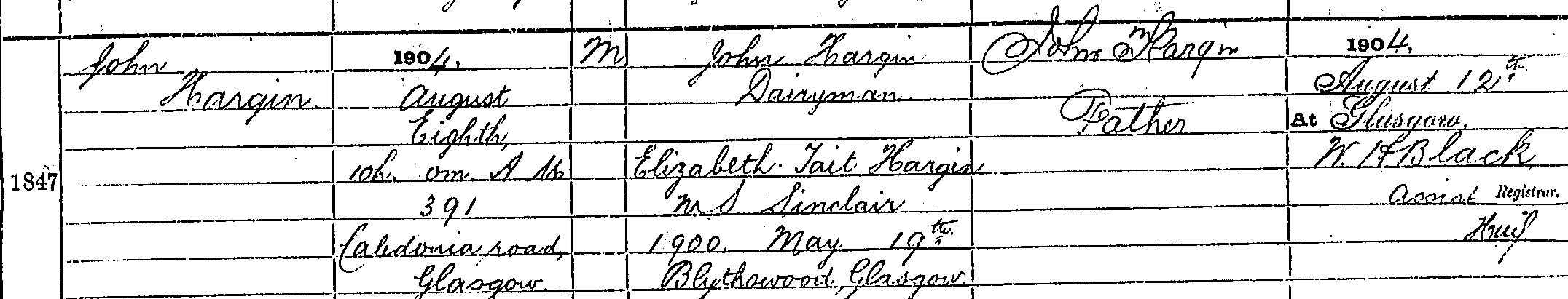 John was born on August 8th, 1904 in Glasgow, Lanarkshire, Scotland.  John's father was John Hargin and his mother was Elizabeth (Liz) Tait Sinclair.  His paternal grandparents were John Hargin and Bridget McGinn; his maternal grandparents were Robert Sinclair and Ann  Purdie Falconer Tait. He had two brothers and a sister, named John, Robert and TootsieRobert and John were twins.