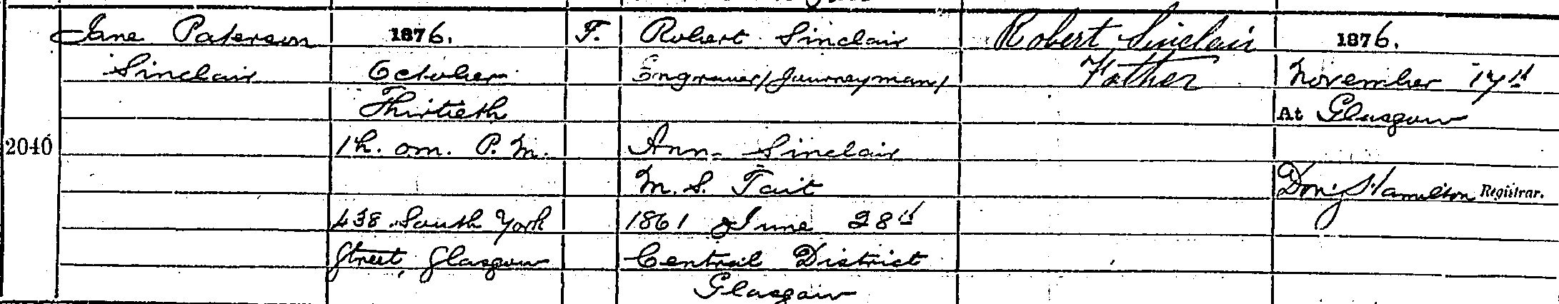 - b.30 Oct 1876 in Glasgow, Lanarkshire, Scotland d.02 Feb 1939 in Royal Infirmary Glasgow, Lanark, Scotland
