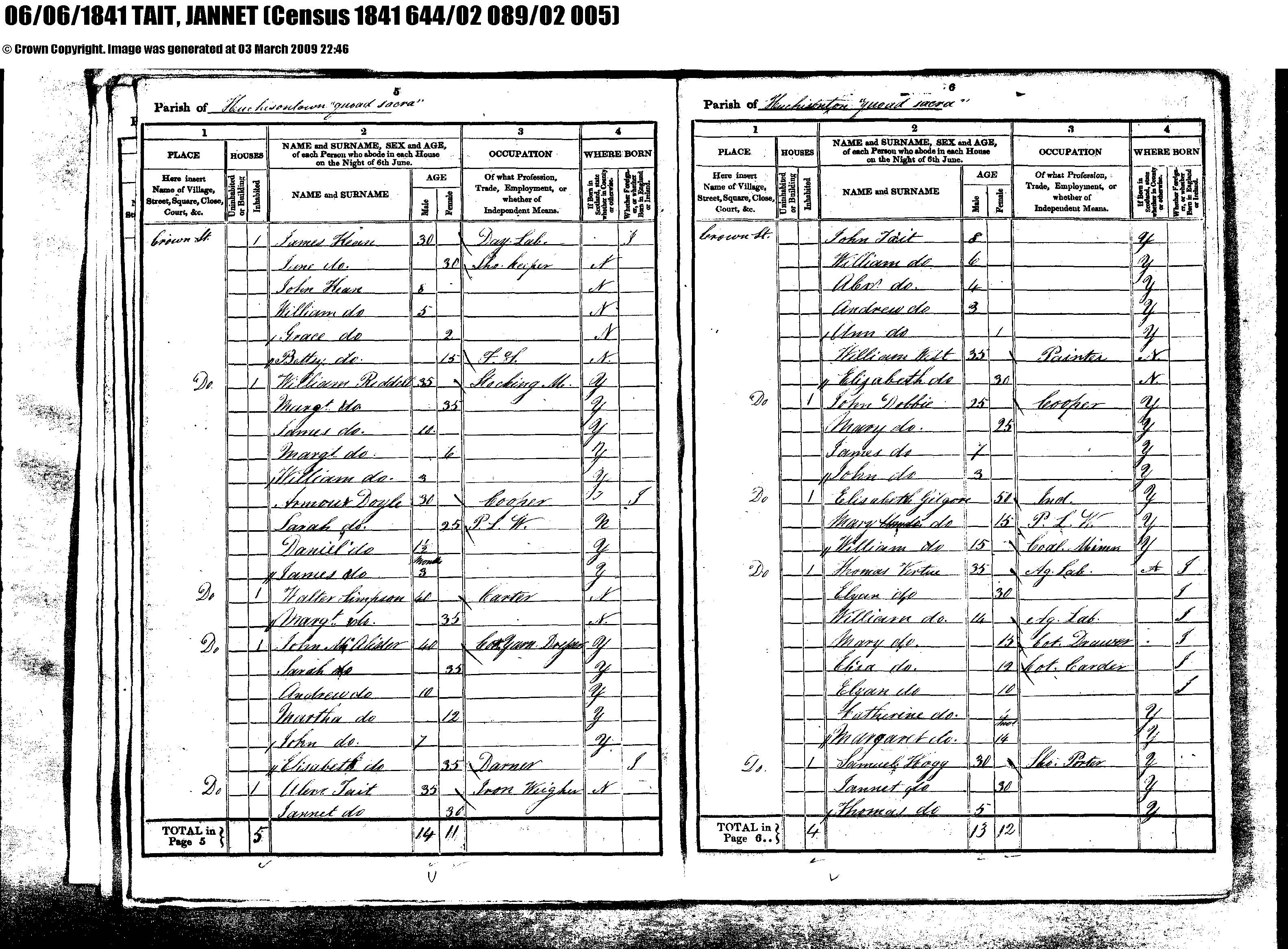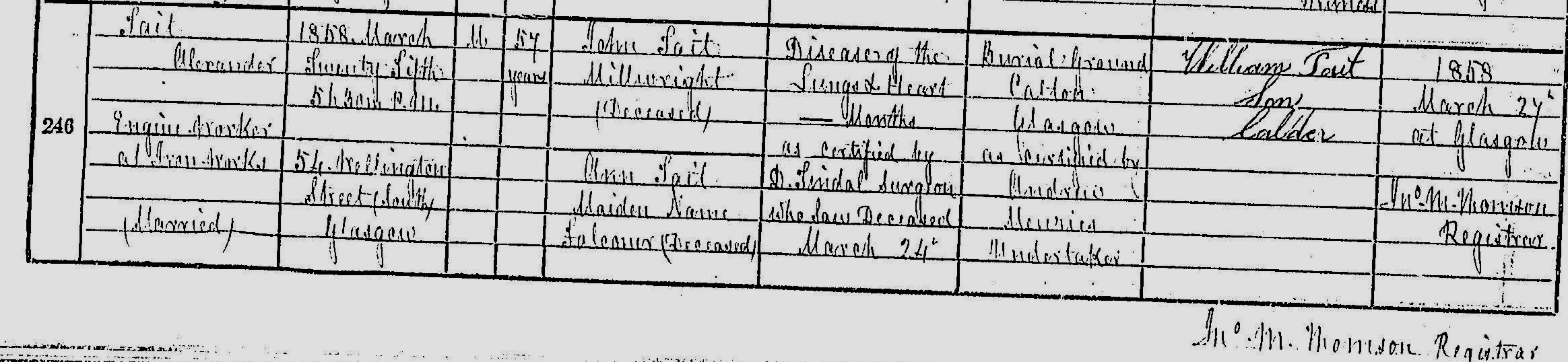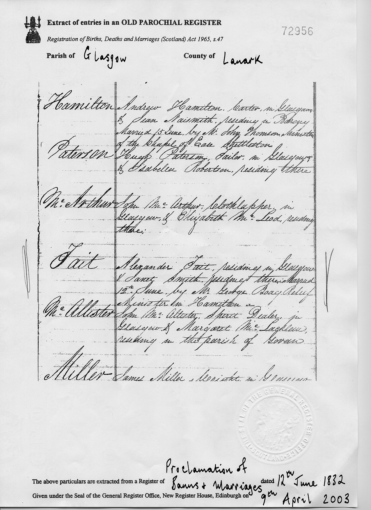 - b.11 May 1801 in Sorn, Ayrshire, Scotland d.25 Mar 1858 in Hutchesontown, Glasgow, Lanark, Scotland