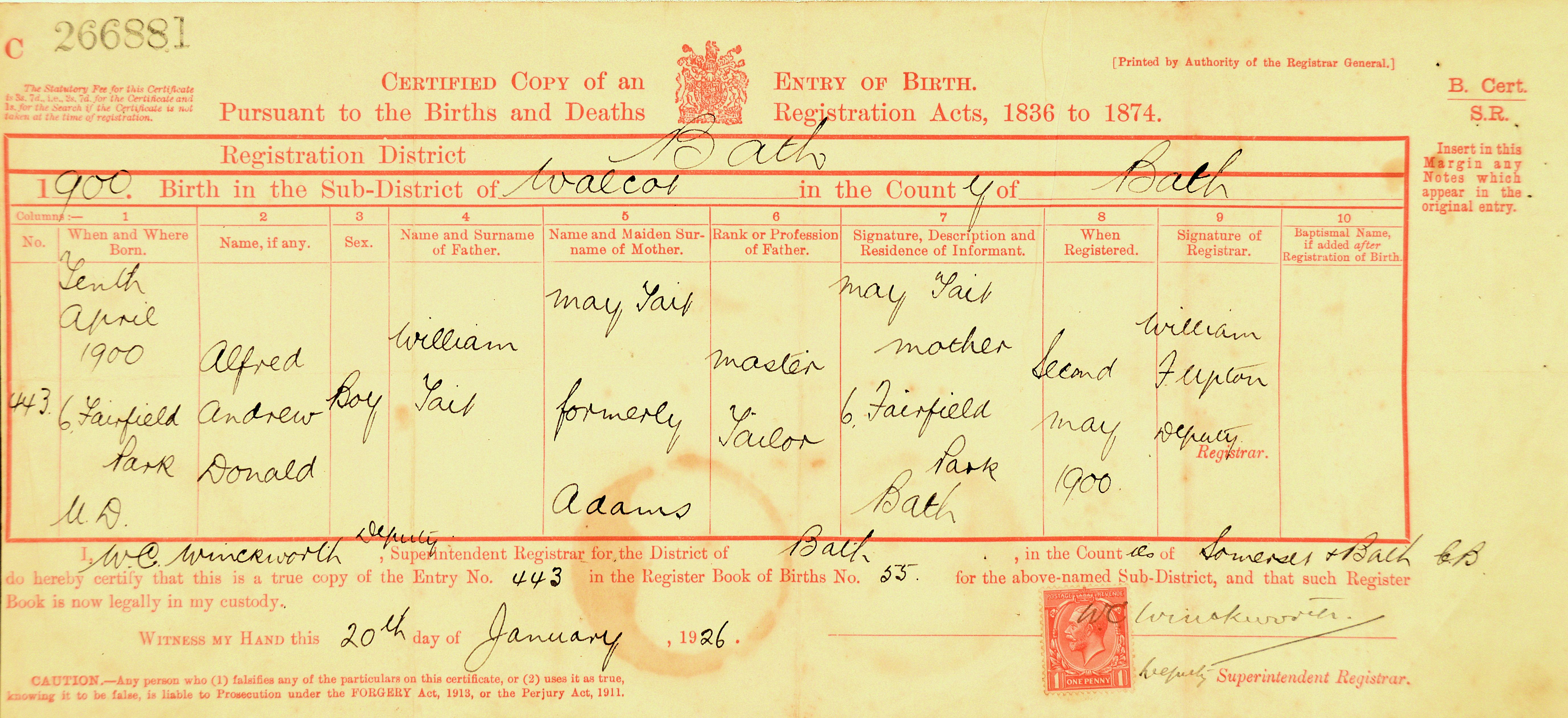 - b.10 Apr 1900 in Bath, Somerset, England d.03 Feb 1973 in Bath, Somerset, England