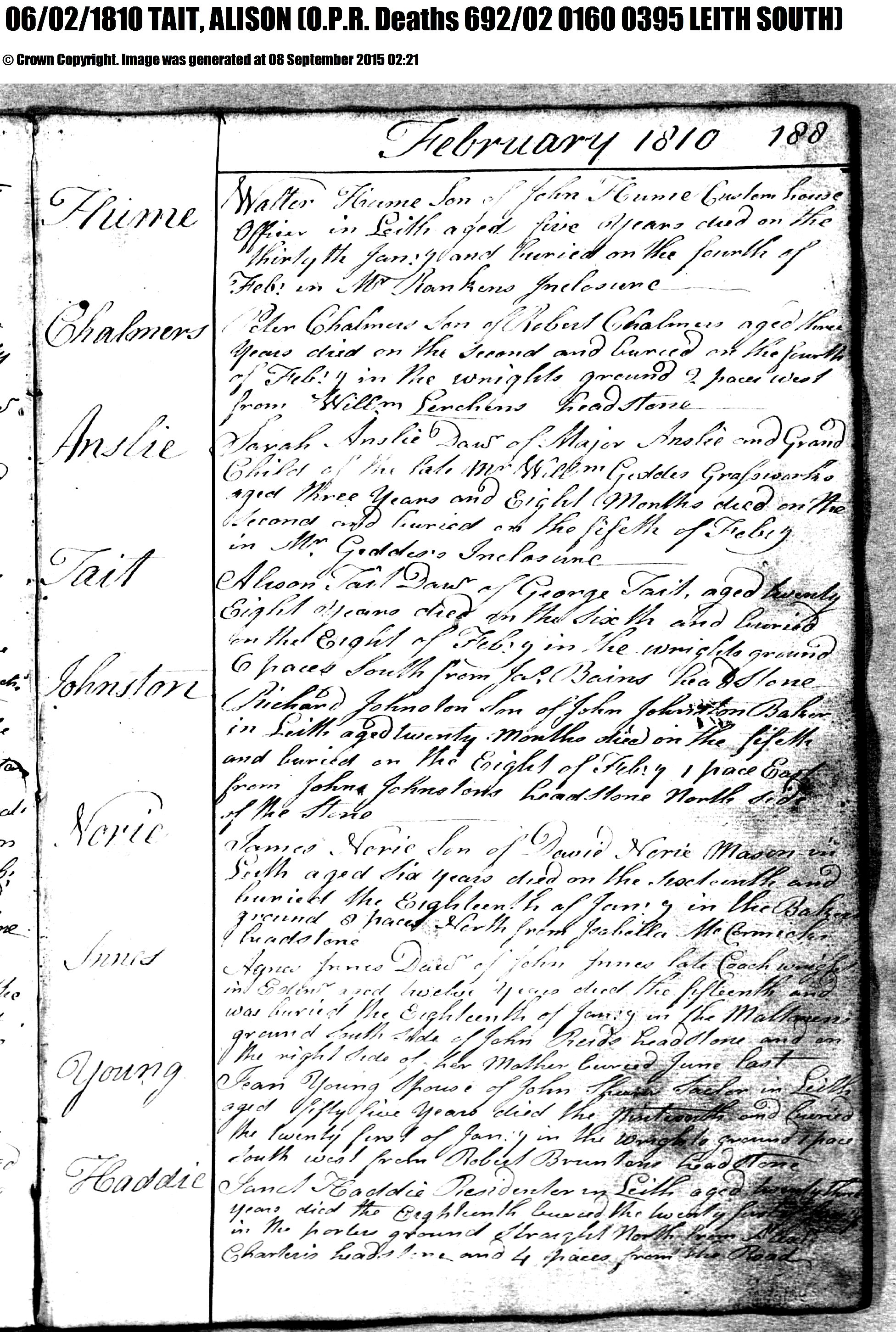 - b.08 Dec 1615 in North Leith, Edinburgh, Midlothian, Scotland