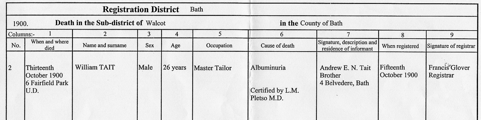 - b.~Sep 1874 in Liverpool, Lancashire, England d.26 Oct 1900 in Fairfield Park, Bath, Somerset, England