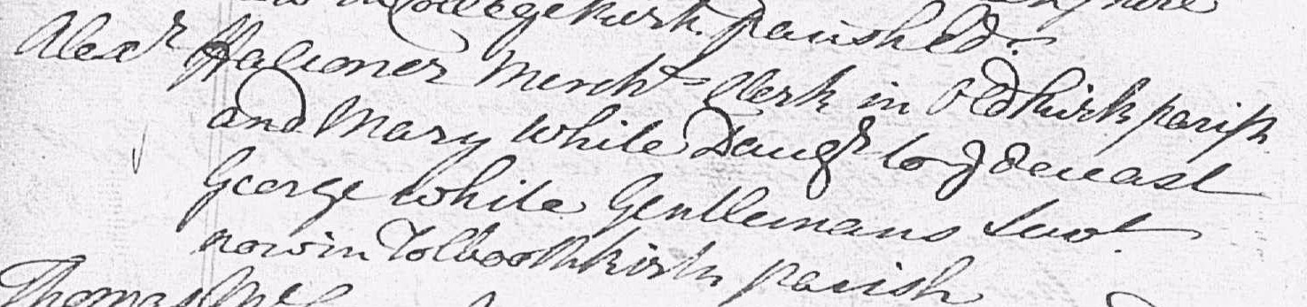 Falconer, Alexander, merchant's clerk in Old Kirk p., and Mary, d. to deceast George White, gentleman's servant, now in Tolbooth p. 14 Feb 1768