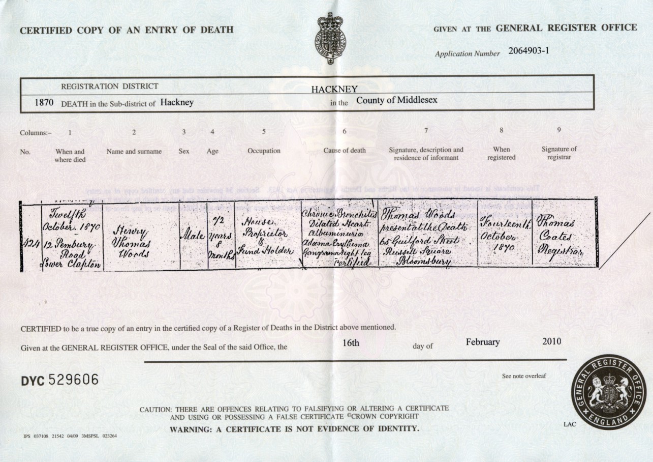 Hackney, London, Middlesex, England. He was buried on October 24th, 1870.