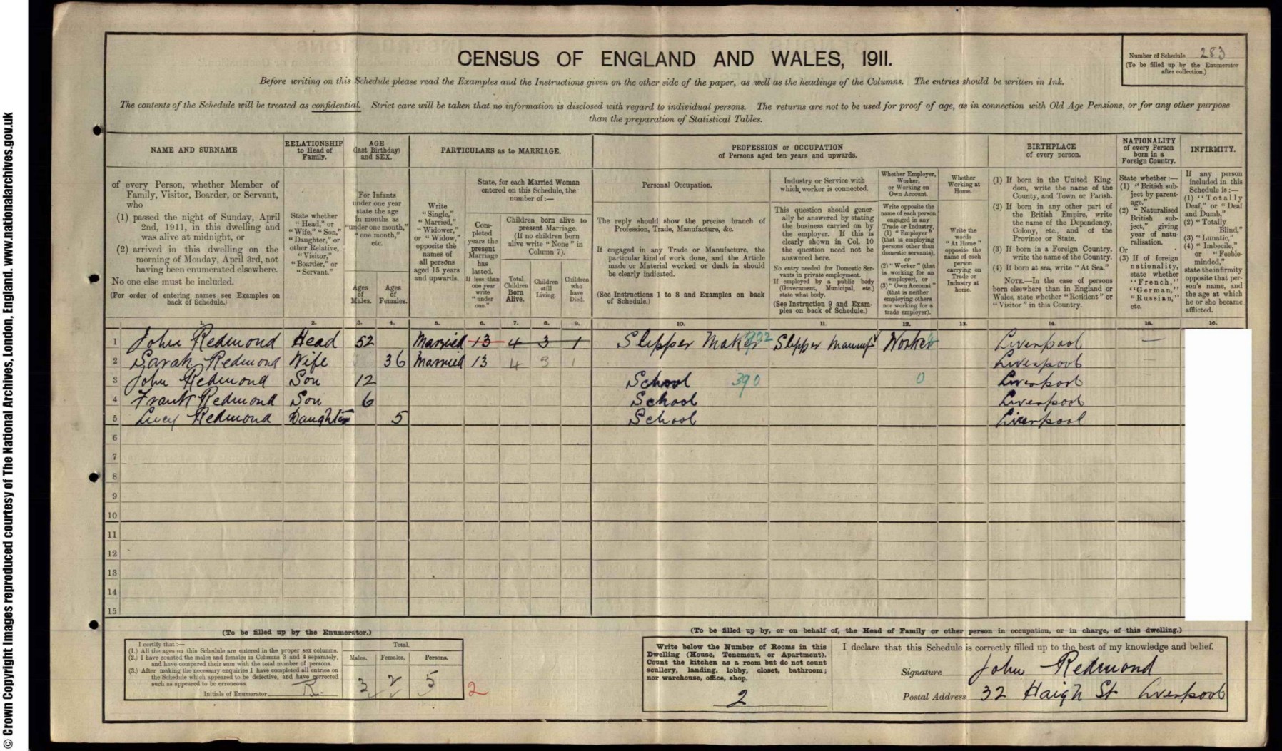 Dimensions: 1796x1053 pixels  (1.89 MegaPixels in total) Size: 489KB <96dpi 24 bpp, source file: C:\Pictures\John J Redmond 1911 census.jpg
