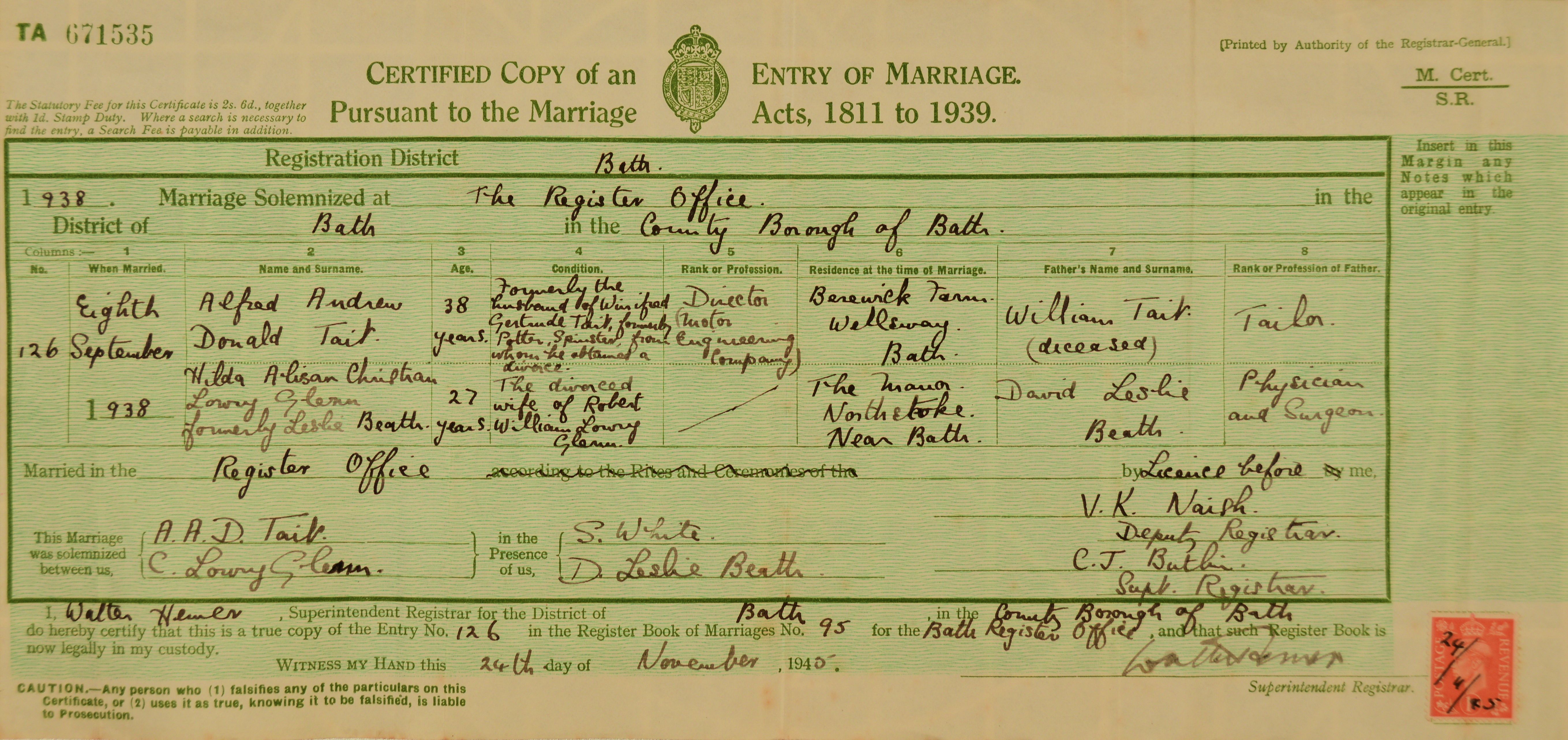 Picture Christian Beath - Donald Tait marr.cert 1938